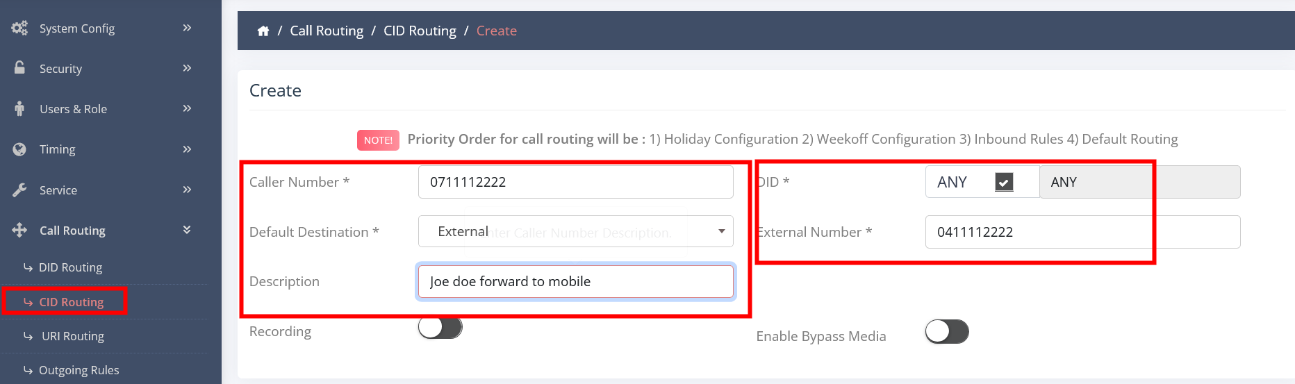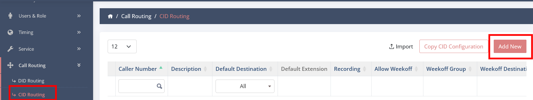 - Click on CID ROUTING