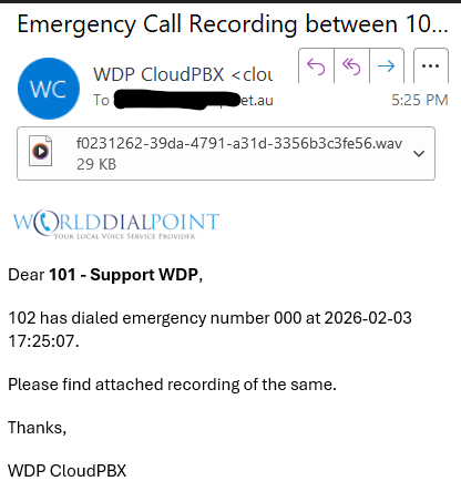 A new feature has now been released in Feb 2026 were any calls within an Organization to 000 Emergency Services can be monitored and notify immidiately a specific exentension (Manager / Reception ect..)