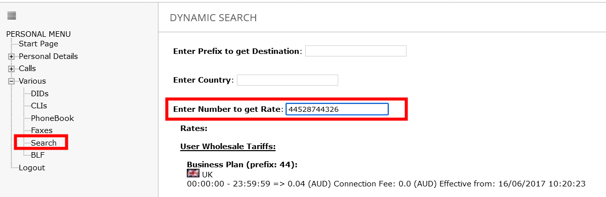 - Enter Number to get Rate: (number needs to be entered in E164 format. For example a number for UK (+44528744326) you enter 44528744326
